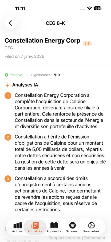 Dans l’exemple ci-dessus, l’IA m’informe en quelques secondes que Constellation Energy vient d’acquérir Calpine Corporation, et que cette opération s’accompagne d’une dette de 5 milliards de dollars. Ce type d’information, normalement enfouie dans des documents de dizaines de pages en anglais juridique, devient accessible en un coup d’œil.