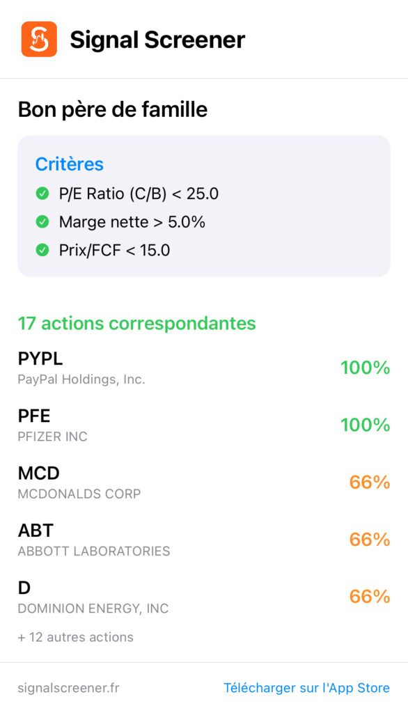 Actuellement, avec ces trois critères, le screener identifie 17 actions éligibles parmi celles que je suis. Parmi les mieux notées : PayPal et Pfizer remplissent 100% des critères, tandis que McDonald’s, Abbott Laboratories et Dominion Energy en remplissent deux sur trois.