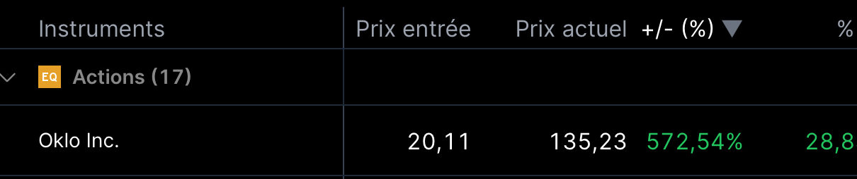 Prenons l’exemple d’Oklo Inc., issue de ma stratégie des pelles et pioches dans l’énergie nucléaire. Position entrée à 20,11€, aujourd’hui à 135,23€ : +572% dont +28,83% sur la dernière journée. Soit largement mieux qu’un Nvidia.